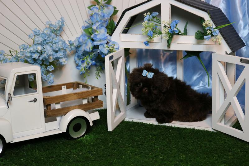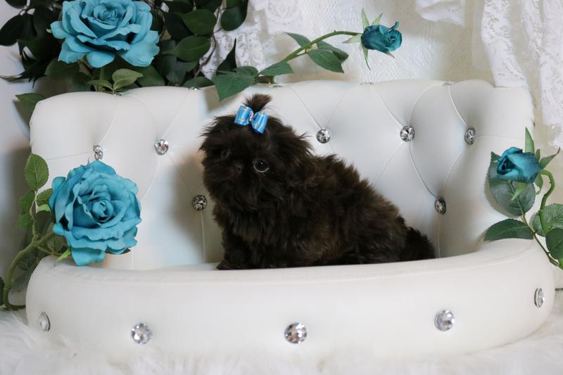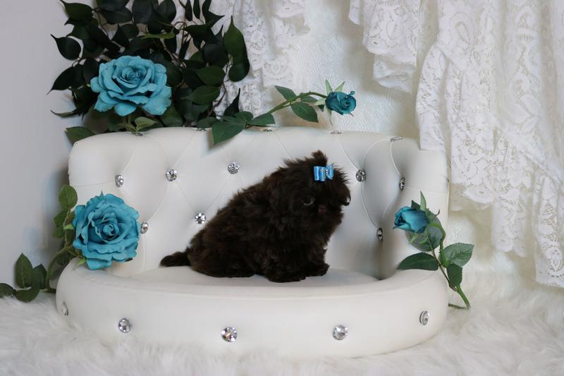 below is GUCCI from the above parents will be offered soon, she is the dark chocolate and the biggest one of the litter, she is charting to be 7 pounds so should be big enough for those that choose to breed, she is listed at 3500 has gorgeous hair, a tiny flat face and tiny brown button nose, she is out going and we showed her mom and dad never got over 4 pounds..