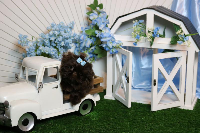 below is TYRA she is dark chocolate, with gorgeous thick fluff hair, she has the big green expressive eyes, and the very tiny button brown nose.. she is short and cobby and adorable.. we were holding her back for showing but her nose is slightly pinched and we arent sure she will grow out of it before the show... she is charting to be 7-8 poumds. she will be offered at 3500 with the ckc registration or 500 additional fee for the akc which can be added anytime the first year.