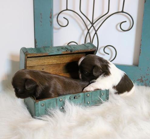 this little girl BELOW we call DIOR she was born aug 28th she is the dark chocolate and white parti color.. she is the smallest and a little spitfire... she will also be offered at 2500 with ckc registration or 3000 with akc.full registration.. she is maturing into a beautiful little girl.. we held her back because she was the smallest one but she has learned everything before the others.. she is doing great and is staying very small. .. she finished all of her puppy vaccines and is potty pad trained she is ready for just about anything...6 WEEK PHOTOS ON PINK with white chair , 12 WEEK PHOTOS BELOW THOSE on pink bed, and also on the teal